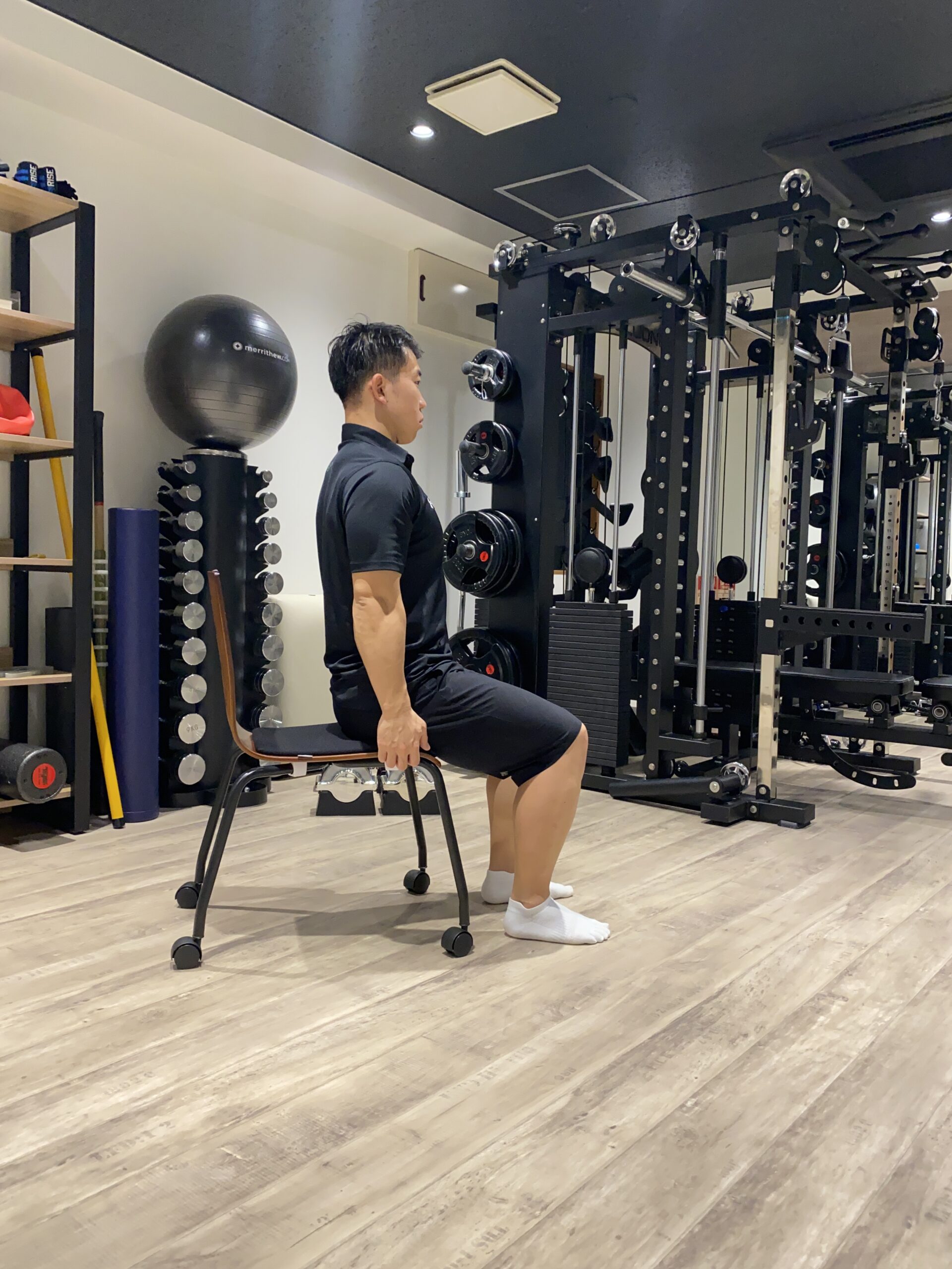1.イスに浅く腰掛け、膝のすぐ下に足首を置く