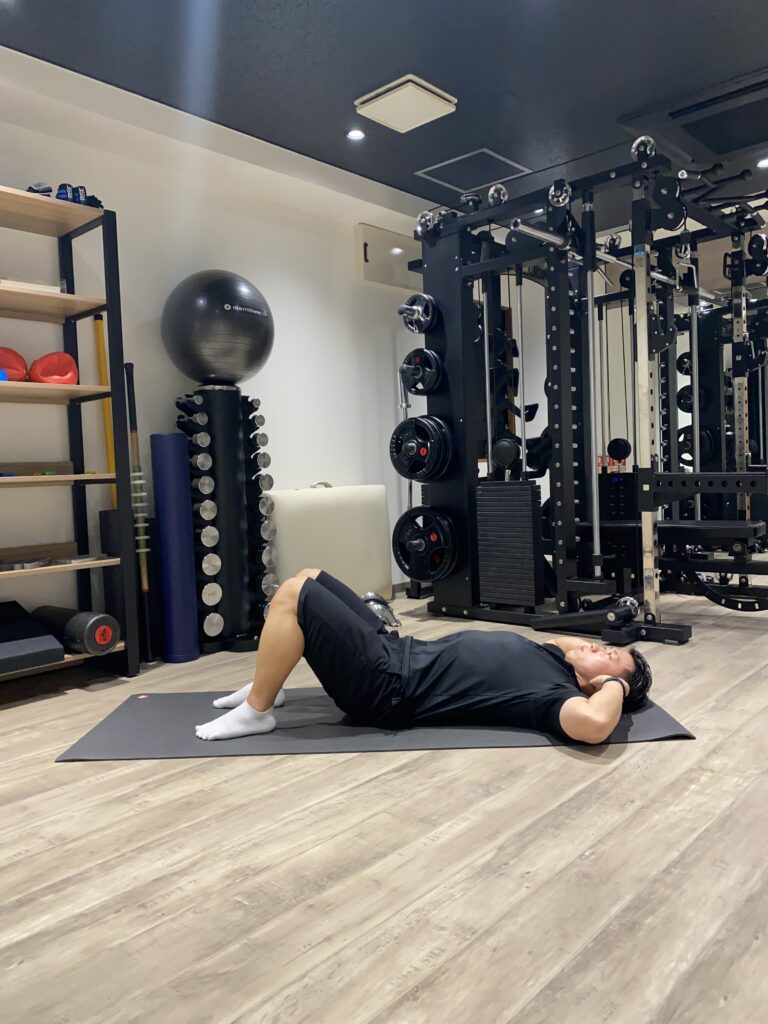 1.仰向けの姿勢で膝を立て、膝を閉じ腰を床につけます。
