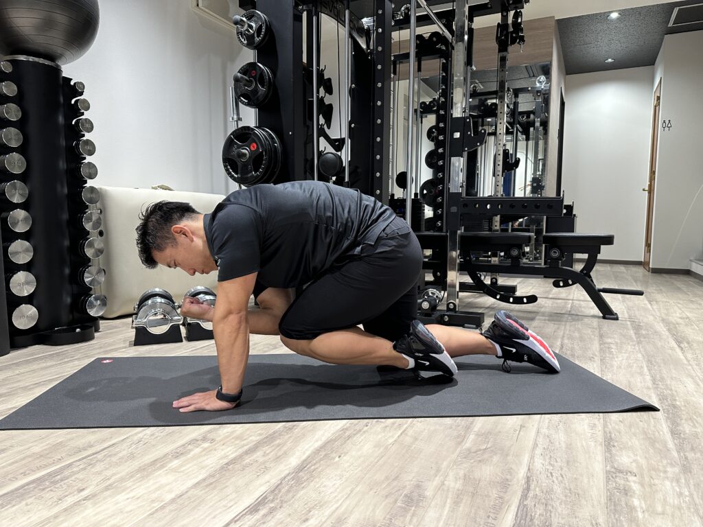 1.四つん這いの姿勢を取り、肩の真下に手首、骨盤の真下に膝が来るようにし姿勢を保つ。
