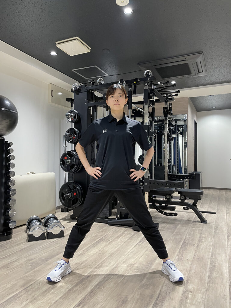 1,足を肩幅より広めに開き、足先と膝を外側に向けます。