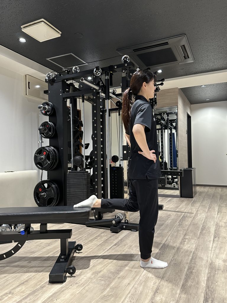 1.片足を前に出し、反対の脚をベンチやイスの上に乗せる。